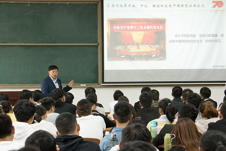 10月9日下午,校长杨小林走上思想政治理论课讲台,在3号教学楼206教室,以《壮丽70年,奋斗新时代》为题,为安全学院消防工程专业约200名大一学生讲授《形势与政策》课。