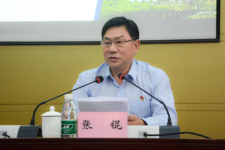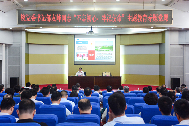9月22日下午,校党委书记邹友峰在一号综合楼学术报告厅为校处级干部讲授“不忘初心、牢记使命”主题教育专题党课《如何做一名合格的中层干部》。省委第十巡回指导组长、河南工业大学原党委书记戚世钧,巡回指导组成员闫业锋,校领导安士伟、张锟、陈自录、赵同谦、翟耀南和200多名中层干部聆听党课。副校长张锟主持党课报告会。