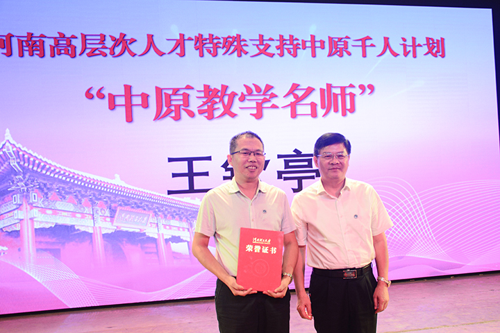 校党委书记邹友峰为“中原教学名师”王钦亭颁奖