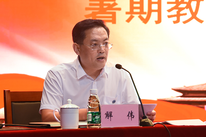 副校长解伟在开班仪式上做动员讲话。他指出,学校的根本任务是人才培养,人才培养的关键在教师。教师队伍素质与水平是学校坚持内涵发展,不断提高教学质量、学术水平、创新能力以及国际竞争力的决定性因素。举办暑期教师培训班是全面贯彻落实全国、省教育工作会议精神,提升教师教学能力的重要途径。解伟要求,广大教师要切实增强学习的紧迫感和使命感,以培训为新起点,认真聆听专家讲授,感悟大家风范,追求卓越精神,以德立身、以德立学、以德施教,全心全意做学生锤炼品格、学习知识、创新思维、奉献祖国的引路人。要严格遵守培训纪律,珍惜学习机会,主动与专家交流,学习相关知识,开阔思维视野,更新观念意识,切实提高能力素养,改进教育教学和工作方法,更好地履职尽责。要学深悟透、学以致用,认真思考、消化吸收,在今后的工作中以饱满的热情、昂扬的斗志、扎实的作风,积极投入工作,做到有的放矢,把学习成果转化为改进工作的强大动力。解伟强调,全校教职工要自觉践行习近平总书记提出的“四有”好老师标准,不忘初心,牢记使命,积极进取,无私奉献,努力在平凡的岗位上成就不平凡的事业,奋力建设国内一流特色高水平大学,以优异成绩向新中国成立70周年和建校110周年献礼。