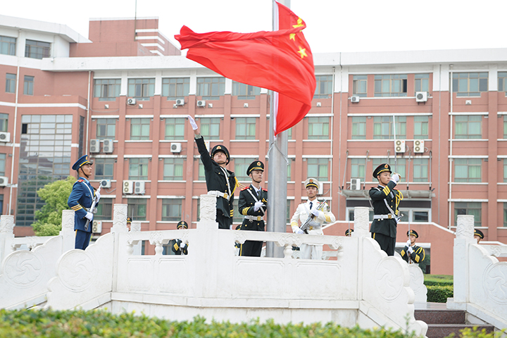 6点50分,升旗仪式正式开始。迎着朝霞,全体同学整装肃立。国旗护卫队队列整齐、步伐坚定,护送国旗前进,在庄严雄壮的国歌声中,五星红旗冉冉升起,全体师生行注目礼,齐唱国歌。