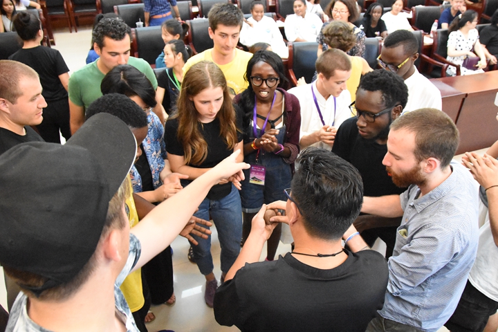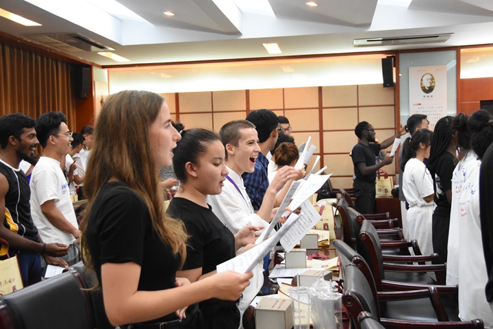 8月10日晚,营员们在明德楼一楼会议室学唱中国民歌《茉莉花》。