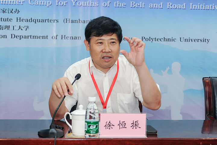 徐恒振致辞。他向营员们介绍了河南省的历史文化背景。他讲到河南省是世界华人宗祖之根、华夏历史文明之源,是中国姓氏的重要发源地,资源丰富,人口众多,区位优越,是中国重要的经济大省、农业大省、教育大省。接着,他介绍了河南省的教育现状以及河南省与共建“一带一路”国家在教育交流与合作方面取得的成绩。他指出,河南省积极参与建设“一带一路”行动目标、重点任务及保障条件,通过搭建互联互通平台,实施合作办学推进计划、留学推进计划等,全方位地推进与共建“一带一路”国家的教育务实合作,深化我省与共建“一带一路”国家的教育交流与合作。今年是河南省第13年接待由孔子学院总部/国家汉办主办的夏令营,累计接待人数达3000余人。河南理工大学作为河南省汉语国际推广太极文化基地,有丰富的太极文化资源和汉语国际推广工作经验,他希望营员们在这里通过体验太极拳、太极文化,对中原文化和中华文化有更深入的了解,并以此为契机,进一步促进中国与共建“一带一路”国家的人文交流,加深各国青年之间的了解和友谊。