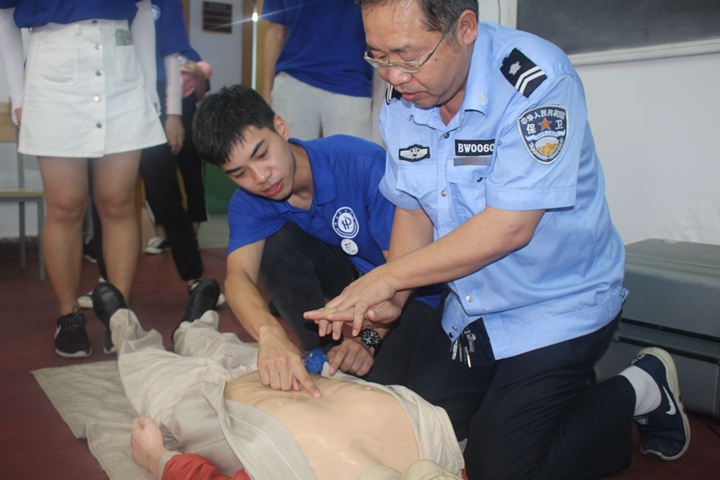 培训会上,队员们结合自身专业知识,以“普及应急知识,提高社区居民自救互救能力”为主题进行讲授,并利用CPR模拟人对社区工作人员演示了心肺复苏与海姆立克急救法。队员们向工作人员展示了急救物品及相关医疗设备,并就其适用情况与功能进行了详细说明。随后,社区工作人员在队员们的指导下进行实践操作。课后,队员们对社区工作人员提出的安全问题逐一进行了解答,获得社区工作人员的一致好评。