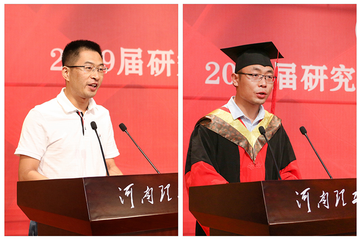 在庄严的国歌中毕业典礼正式拉开帷幕。安士伟、张锟、赵同谦分别宣读了授予博士和硕士研究生毕业证、授予硕士研究生学位证、校级优秀学位论文和优秀实践成果评选结果以及表彰省级和校级优秀毕业生的决定。在欢快的音乐声中,校领导为2019届优秀毕业生代表和获奖代表颁发荣誉证书并合影留念。电气学院副教授卜旭辉、能源学院博士毕业生张钧祥分别代表导师和毕业生上台发言。