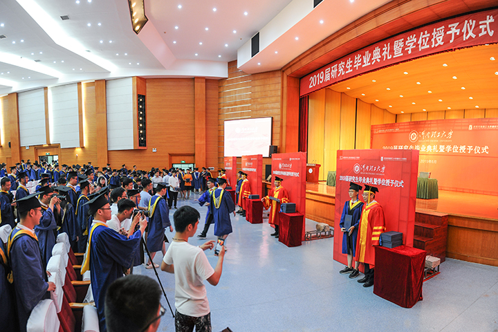 在随后的学位授予仪式阶段,校领导为全体2019届硕士毕业生拨流苏,颁发学位证书并一一合影留念。