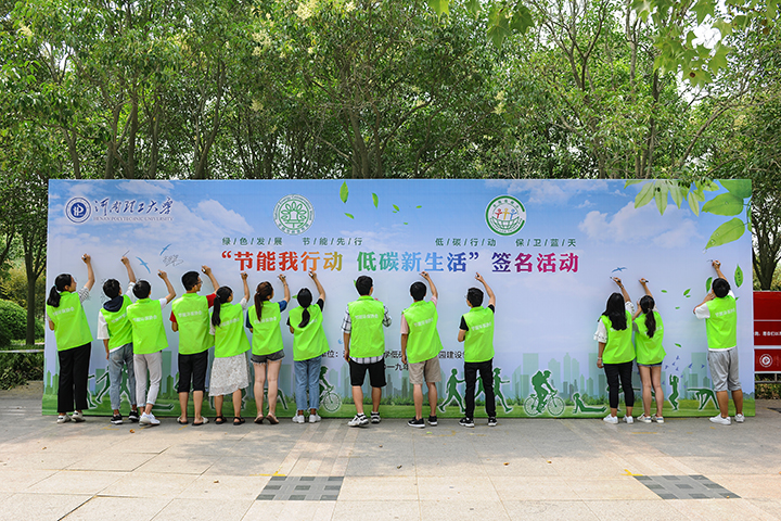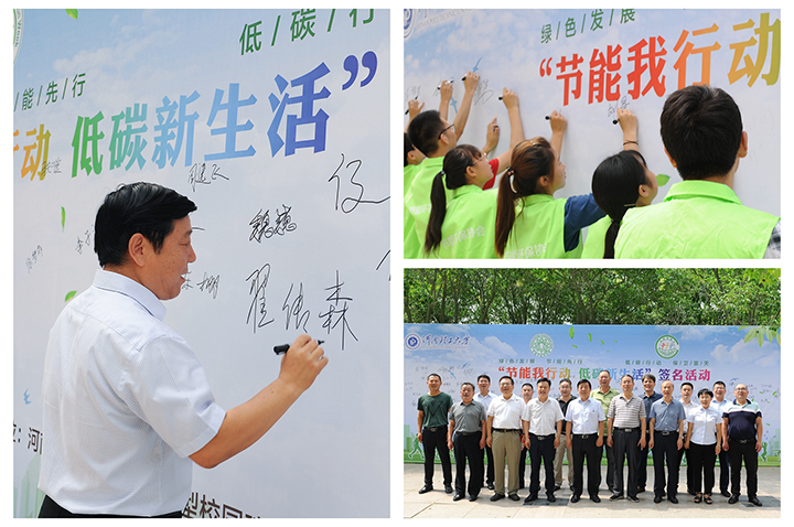 为认真贯彻落实国家发展改革委《关于2019年全国节能宣传周和全国低碳日活动的通知》及省事管局等五单位《关于印发2019年河南省公共机构节能宣传月活动安排的通知》文件精神,6月19日,在全国低碳日当天,由我校低碳节约型校园建设领导小组主办,后勤管理处(集团)承办的“节能我行动,低碳新生活”主题签名活动在明德广场举行,副校长翟传森出席,校低碳节约型校园建设领导小组成员参加活动。