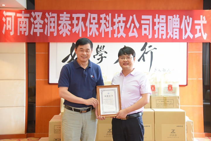 捐赠仪式上,赵俊伟代表学校向泽润泰环保科技公司颁发了捐赠证书。