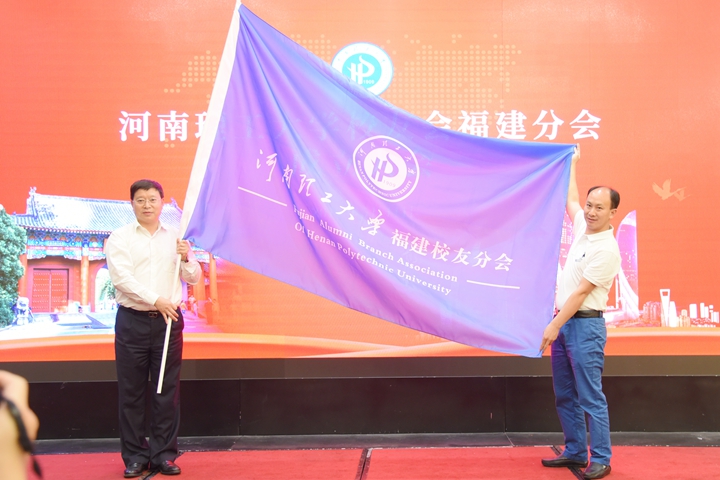 在与会校友热烈的掌声中,杨小林为况玉颁授福建校友分会会旗。