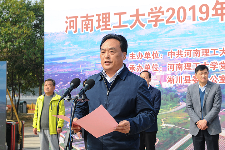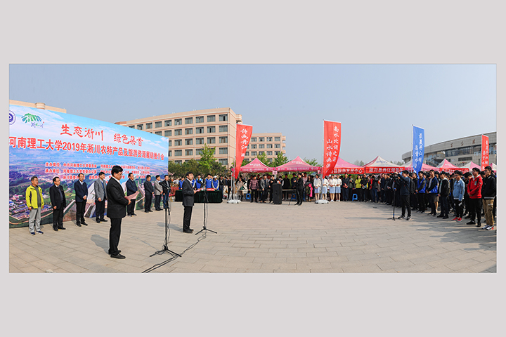 为深化校地结对帮扶,助力淅川脱贫攻坚,4月11日上午,由校党委、校行政和淅川县委、县政府共同组织策划的淅川县农特产品及旅游资源展销推介会、校地结对帮扶交流推进会分别在学校南校区东体育场西侧广场和力行楼一楼会议室举行。校党委副书记安士伟、副校长赵俊伟,淅川县委书记卢捍卫,县委常委、县委办公室主任李培迁,县委常委、副县长李明东、陶华,县人大常委会副主任王达忠出席推介会启动仪式及交流推进会。启动仪式及推进会由副校长张锟主持。