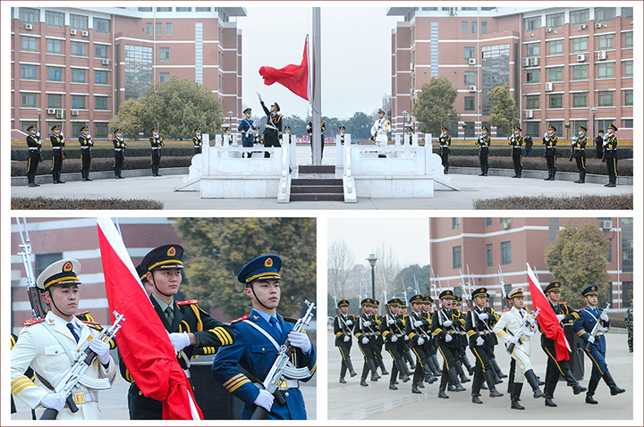 7时整,22名国防生踏着铿锵有力的步伐护卫国旗入场。伴随着雄壮的国歌声,鲜艳的五星红旗冉冉升起,全体师生行注目礼。
