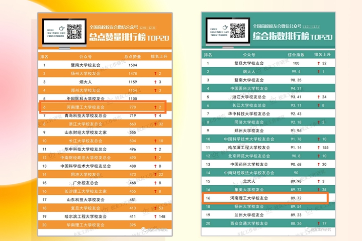 年终岁尾,校友工作又传喜讯。日前,“校友工作研究”微信公众号发布2018年12月“全国高校校友会微信公众号综合指数排行榜”,“河南理工大学校友总会”微信公众号以总点赞量770的优异成绩,在“最受欢迎公众号排行榜”中排名全国第6,较11月上升了2个位次,同时综合指数位居全国高校第16位,综合影响力在河南高校中仅次于郑州大学,位居第2。