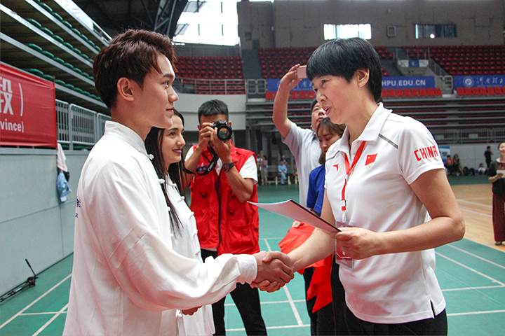 焦作市体育局局长肖萍为营员代表赠送第十届中国焦作国际太极拳交流大赛参赛邀请函
