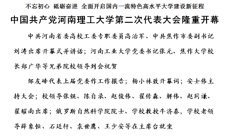 杨小林致开幕词。高治军讲话,他代表省委高校工委和省教育厅向大会表示祝贺,并充分肯定学校在改革发展和党的建设等方面取得的成就。刘涛讲话,他代表焦作市委向大会祝贺并高度评价学校为地方经济社会发展做出的积极贡献。张元代表兄弟院校致贺词。