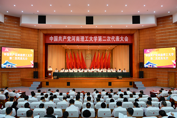 会场内气氛庄重而热烈,主席台上方悬挂着“中国共产党河南理工大学第二次代表大会”会标,主席台后方幕布上十面鲜艳的红旗簇拥着由镰刀和锤子组成的党徽,熠熠生辉,会场后上方悬挂着“不忘初心,砥砺奋进,全面开启国内一流特色高水平大学建设新征程”的大红标语,催人奋进。