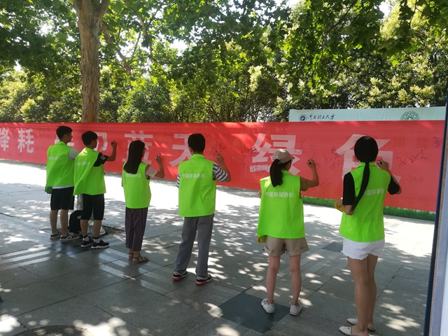 活动前期,后勤管理处(集团)提前策划、精心准备,对各项工作的开展进行周密部署,提前通过校园网最新公告、后勤管理处官方微博发布活动通知,确保活动取得显著效果。活动当天,学校近万名师生自发在签名墙和条幅上签下了践行节能环保的态度和决心,不时有参与活动的学生驻足留影。活动现场,由大学生节能环保协会志愿者发放《节约能源资源倡议书》,提出节能倡议,传播节能知识和节能理念;利用展板宣传、条幅宣传营造浓厚的节能环保活动氛围;“节能降耗,保卫蓝天,绿色校园,你我共建”道出了共建碧水蓝天的美丽畅想。