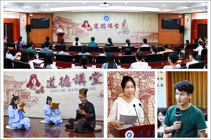 本次“道德讲堂”活动,分为“学模范”“讲故事”“诵经典”“净心灵”“听歌曲”“送吉祥”等环节,相关活动内容较以前有较大调整。在“学模范”环节,大家学习了感动中国2017年度人物、时代楷模、著名地球物理学家、吉林大学教授黄大年和感动中国2011年度人物、全国孝老爱亲道德模范、最美女孩孟佩杰的先进感人事迹;在“讲故事”环节,财经学院张梦瑾向大家深情讲述了党的十九大代表、最美援疆干部、“感动中原”年度人物、我校现代教育技术中心常务副主任三度援疆的动人故事;在“诵经典”环节,在应急学院胡建文的带领下现场师生一起诵读了《道德经》第八章《易性》中的经典片段;在“净心灵”环节,伴随着舒缓的音乐,主持人通过三个问题,引导全体人员静思反省自己是否做到了“信”“爱”“知”“行”这四点;在“听歌曲“环节,与会人员聆听了由谭晶演唱的《四德歌》,领会“爱德、诚德、孝德、仁德”的丰富内涵;在“送吉祥”环节,活动主办单位向大家发放了学校特别定制、刻有“见贤思齐、择善而从”警句的精美纪念礼物。