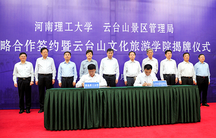 6月2日上午,学校与云台山景区管理局战略合作签约暨云台山文化旅游学院揭牌仪式在力行楼学术报告厅举行。省旅游局局长姜继鼎,省委高校工委专职副书记、省教育厅党组副书记郑邦山,焦作市委书记王小平、市人大常委会主任王明德,市委常委、修武县委书记郭鹏,市委常委、秘书长王建修,市政府副市长魏超杰、市政协副主席范涛,校党委书记邹友峰、校长杨小林,副校长张锟、赵同谦,焦作市发改委、财政局、文广新局、旅游局、教育局、云台山景区管理局、修武县及学校党办、校办、宣传部、学生处、发规处、研究生院、招生就业处、工商学院等单位负责人,旅游管理等专业学生260余人参加仪式。仪式由副校长赵俊伟主持。