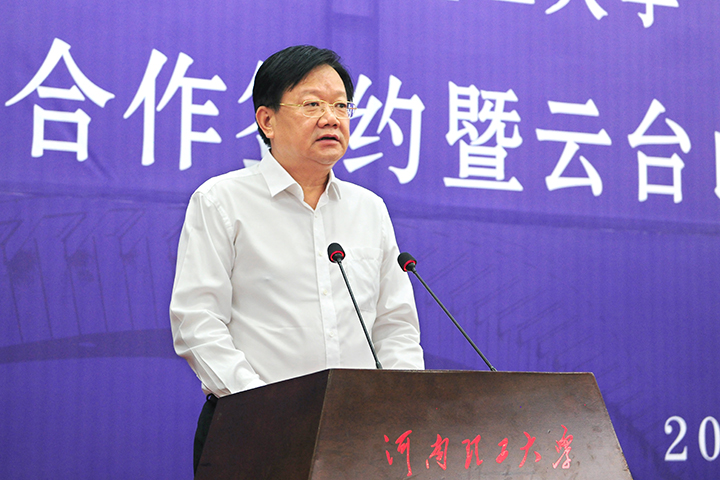 郑邦山在致辞中指出,河南是人口大省、教育大省,也是文化大省和旅游大省。办好教育,办好文化旅游产业,都是促进经济发展、增加就业和满足人民日益增长美好生活需要的有效手段。党的十九大提出,要努力实现高等教育内涵式发展,建设教育强国,对新形势下高等教育发展提出了新的要求。河南理工大学作为百年老校,建校以来,为国家能源工业和地方经济社会发展做出了积极贡献。河南理工大学与云台山景区管理局签订战略合作协议并共建河南理工大学云台山文化旅游学院,不仅是河南理工大学办学史上一件大事、喜事,也是焦作市布局全域旅游战略的一件好事、要事,更是我省高校推进产学研融合的具体实践,对推进校企协同育人,培养新时代创新型旅游人才,都有重大意义,必将对我省高等教育和区域经济社会发展产生积极影响。相信双方一定会通力合作、发挥优势,实现强强联合,为旅游产业创新发展和高等院校产教融合探索开辟出新的发展空间,为推动中原文化走向世界做出新的成绩,成为高层次旅游专业人才培养和培训的重要基地,让云台山景区优秀的管理经验与经营模式,在各地生根开花结果。