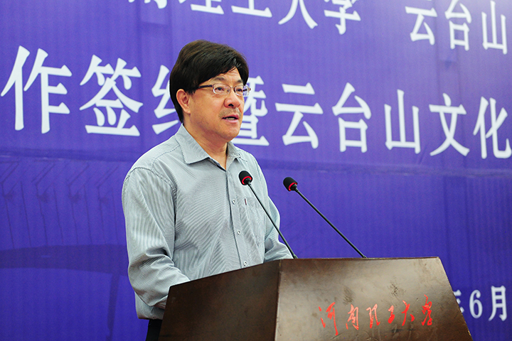 邹友峰致欢迎辞。他指出,当前,随着社会主要矛盾的变化,人民群众对美好生活的向往更加强烈、需求更加多元,文化旅游业就是一个发现美、传播美、享受美,满足人民群众美好生活需求的产业。云台山景区作为全国五A级景区和首批世界地质公园,在信息化建设、标准化管理、品牌化服务等方面享有盛誉,先后获得一系列国际国内大奖,主持制定了多部行业标准,创造了业界瞩目的“云台山效应”,成为焦作城市转型发展的一张靓丽名片。多年来,学校与云台山景区管理局的产学研合作不断深化,学校在云台山建有教学科研基地和国家级大学生校外实践教育基地,数十篇博硕士学位论文以云台山地质、生态、旅游等研究为主题,20多名毕业生扎根云台山景区从事管理工作。特别是去年,市校全面战略合作协议签署以来,在焦作市委、市政府的大力支持下,在焦作市支持河南理工大学改革发展领导小组组长王小平书记的亲自推动下,学校与云台山景区管理局的合作持续深入。王书记多次听取汇报、作出指示,对合作建立河南理工大学云山台文化旅游学院工作给予了具体指导。学校和云台山景区管理局认真落实王书记的指示精神,本着“资源共享、优势互补,互利共赢、持续发展”的原则,经过多次磋商,在深化合作办学、人才培养、师资互聘、科研合作、品牌宣传等方面达成了共识。邹友峰表示,学校将认真贯彻省教育厅、省旅游局和焦作市委、市政府的指示精神,站位服务焦作“四城联创”与加快融入焦作经济社会发展的高度,在机构设置、经费投入、办学条件等方面予以大力支持,推动学院紧贴行业需求,加强相关领域的研究和实践,打造体现双方优势、突出焦作特色的文化旅游教育品牌,为加快焦作、河南乃至全国的文化旅游事业发展培养高层次复合型人才,努力把学院建设成为国内一流、特色鲜明的文化旅游学院,为“四个焦作”建设和全省文化旅游事业发展作出积极贡献。