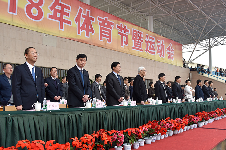 随后,举行了庄严的升国旗仪式。接着,杨小林致开幕词。他说,在师生中持续深入开展体育运动,是提高师生身体机能、提升工作效率、调节心理情绪、培养顽强毅力,营造积极向上校园氛围的重要途径。2017年,我校在体育教研、群众性体育活动开展、高水平运动竞技、太极拳特色体育文化构建等方面取得了丰硕成果,师生健康意识普遍增强,自觉锻炼氛围日益浓厚,太极拳国际化办学初见成效,竞技体育水平稳步提升,进一步扩大了学校知名度和美誉度。学校持续加强体育设施建设,为师生日常健身锻炼、承办高水平赛事提供了可靠的硬件保障。举办体育节暨运动会是对群众性体育工作成果的一次检阅,是对全校师生员工运动水平的一次检验,也是对广大师生员工竞争意识、团队精神、顽强意志的一次培养,更是全校师生员工精神风貌的一次全面展示。希望全体运动员享受运动、享受比赛、享受快乐,赛出风格、赛出友谊、赛出水平;全体裁判员认真履行职责、客观公正执法;全体工作人员各尽其职、周到服务,共同将本次体育节和运动会办成文明、和谐、热烈、精彩的体育盛会;全校师生要以此次运动会为契机,进一步增强健身意识,积极投身体育锻炼,奋力开创学校体育工作新局面,助力绘就健康中国新蓝图!