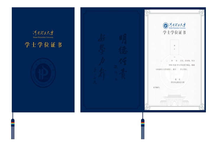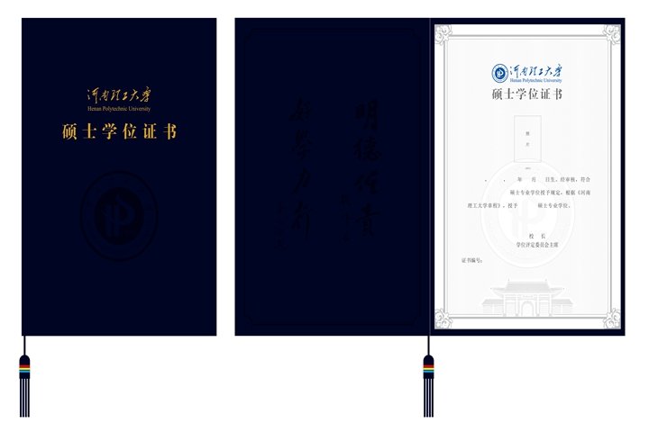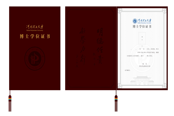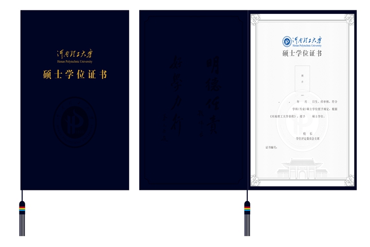 根据国务院学位委员会、教育部《学位证书和学位授予信息管理办法》的文件要求,我校自2016年6月启用了自主设计的“河南理工大学”版学位证书。新版学位证书分博士、硕士、学士3个层级,采用同一版式,分别以传统色彩中的吉祥红、水墨蓝、深蓝加以区分。