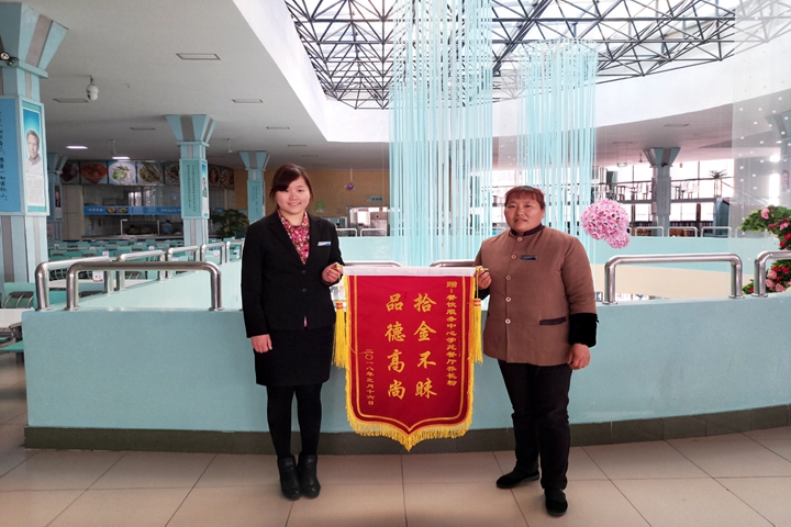 无独有偶,3月19日,我校后勤餐饮服务中心的另一名员工乔长粉收到了孔洋洋送来的充满感谢之意的锦旗,并亲切地与乔长粉合影留念。3月16日,乔长粉在学苑餐厅打扫卫生时,无意间发现了被遗落在凳子上的钱包,面对钱包里近5000元的现金及若干银行卡、身份证、交通卡等物品,乔长粉立即找到管理人员,希望能尽快找到失主。最终,餐饮服务中心通过联系校学生处、校园卡管理中心,后勤管理处(集团)信息化办公室、质量监督管理科等部门,并采用在后勤网站失物招领处刊登失物招领信息等方法,及时与失主取得联系,将钱包原封不动的送回失主手中。