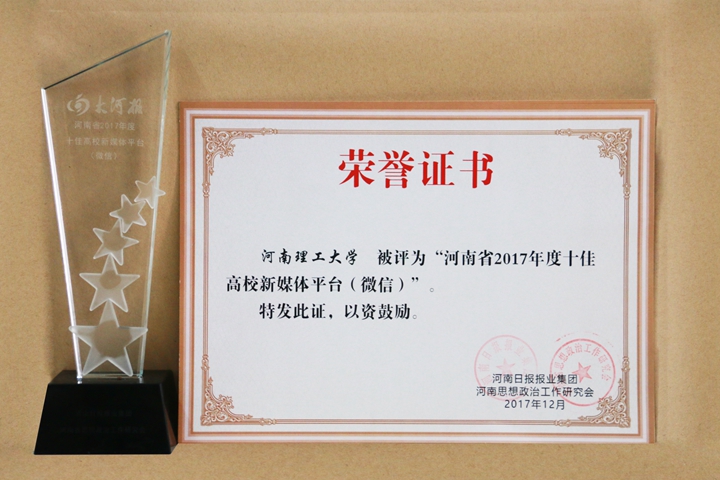 日前,河南省第二届大学生新媒体原创作品大赛暨2017年度十佳高校新媒体平台评选颁奖典礼在河南日报报业集团大厦举行,我校官方微信荣获“河南省2017年度十佳高校新媒体平台”。这是我校官方微信自2015年4月18日上线以来,相继取得“全国高校排行榜中部明星榜第一名”、2016年度“河南省教育系统十佳政务微信”、2016和2017年度“河南省十佳高校新媒体平台”等多项荣誉后,获得的又一殊荣。