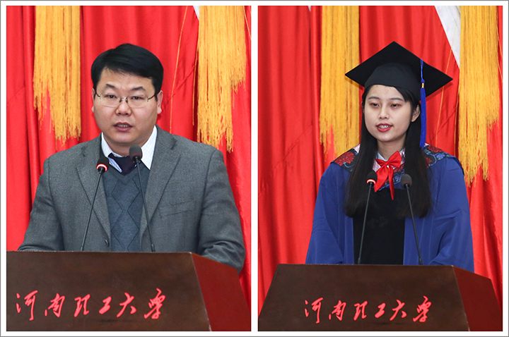 导师代表、资环学院教授郑德顺向毕业生们表示祝贺,希望大家心怀远大志向,努力成长为在本专业内卓有建树的人。文法学院冯馨培代表毕业研究生向母校表达了诚挚的谢意,并表示铭记校风和校训,在新起点上接力前行。