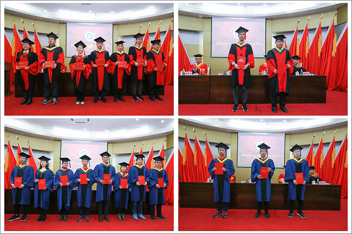在学位授予仪式阶段,校领导为全体2018届硕士毕业生拨流苏,颁发学位证书并一一合影留念。