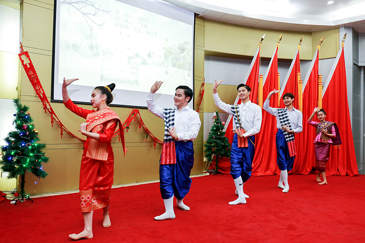 晚会在老挝学生表演的充满异域风情的老挝传统舞蹈《追姑娘》和《祝贺》中拉开了帷幕;中外学生合唱的《童话》温暖动人,充满了跨越国家民族的同学情谊;来自孟加拉、老挝、韩国的国际学生分别带来了婉转动听、风格各异的歌曲表演;我校舞蹈协会友情出演的华尔兹舞蹈《天下无双》优雅妙曼;体育学院学生的表演《功夫》融合剑、长矛、太极等传统武术,展现了中华武术文化的博大精深,获得观众阵阵掌声。整场晚会气氛热烈,笑声不断,还穿插了有趣的“击鼓传花”和“猜词”游戏环节。