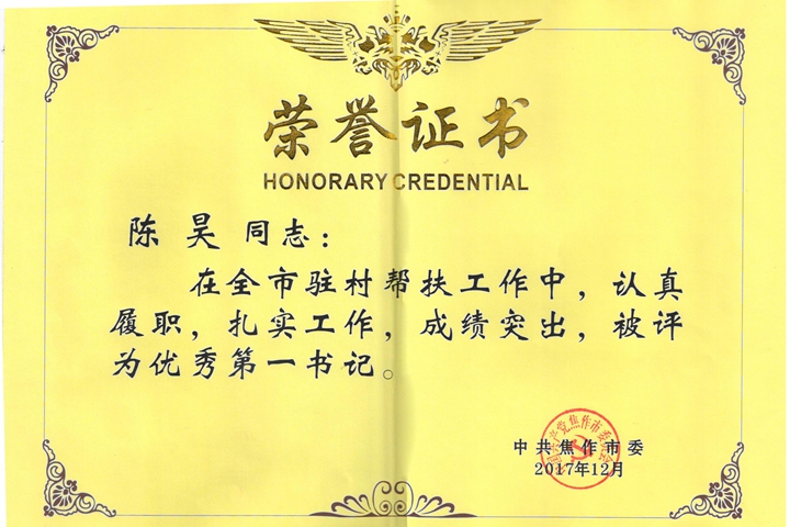 2015年8月,陈昊受学校选派到博爱县南朱营村担任驻村第一书记。在两年多的扶贫工作中,陈昊吃住在村,扎根基层,紧紧围绕第一书记四项基本职责和12项任务清单,依托我校教育优势,采取抓好党建促脱贫、产业转型助增收、发展教育挖穷根等6项措施,为南朱营村争取到各类扶贫资金700余万元,实施扶贫项目15个,涵盖了绿化、硬化、亮化村内道路,建设文化广场、老年幸福院,创建无公害蔬菜和水果产业扶贫基地,资助大病患者和贫困学生,发展壮大村集体经济等惠民工程,解决了南朱营村“致富难”“出行难”“看病难”“上学难”等一系列老大难问题。目前,南朱营村建档立卡的106户贫困户、457名贫困人口,已有93户、405人实现了稳定脱贫。陈昊在省派第一书记年度考核中连续两年获得优秀,被评为河南省“扶贫青春榜样”、“‘时代丰碑’博爱英模人物”、博爱县“十佳优秀共产党员”、“两学一做”之星和帮扶脱贫标兵等荣誉称号。