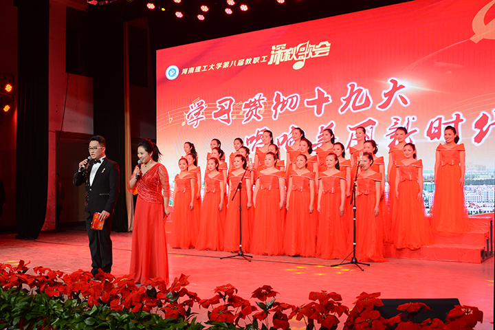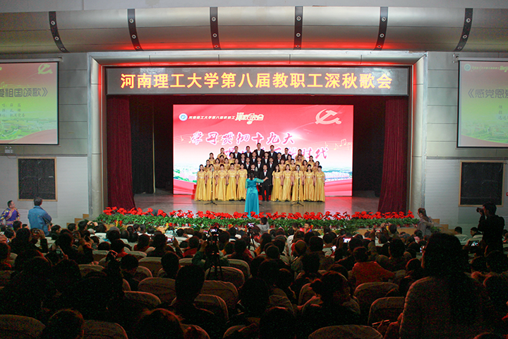 为深入学习宣传贯彻党的十九大精神,活跃教职工校园文化生活,11月24日晚,河南理工大学第八届教职工深秋歌会在小礼堂隆重举行。歌会以“学习贯彻十九大,唱响美丽新时代”为主题,以合唱形式呈现。相关职能部门、学院负责人与师生代表700余人共同观看了歌会。