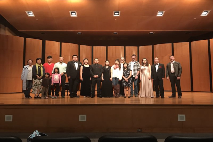 11月20日,我校音乐学院教师代表团受邀访问美国德州三一大学开展音乐文化交流,并成功举办音乐会。音乐会由三一大学美籍华人教授李佳蔚主持,我校音乐学院教师李新现、赵杰、董荻演唱,赵静静、宁翔良子担任伴奏。