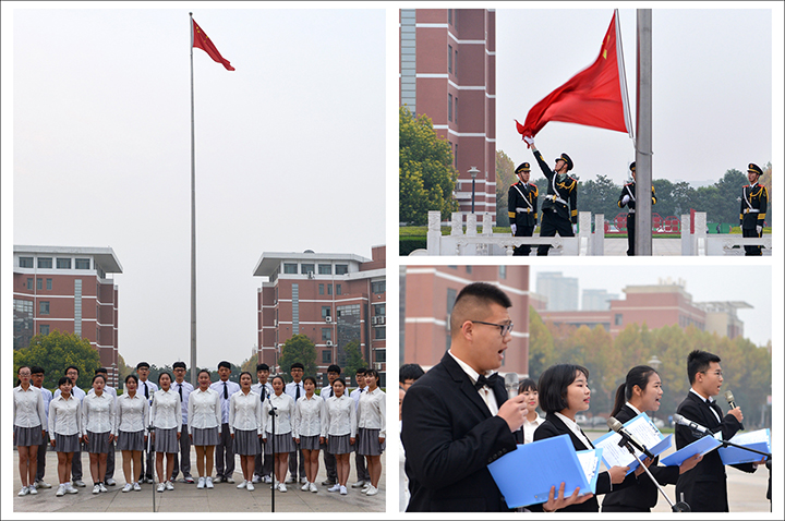 迎着初升的朝阳,伴随着庄严的《义勇军进行曲》,五星红旗冉冉升起,全体师生面向国旗行注目礼。