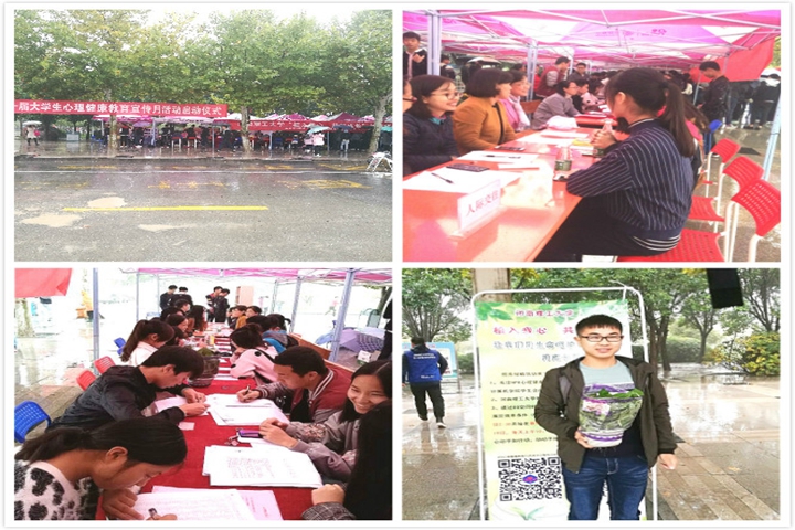 10月17日下午,由学生工作部(处)、心理健康教育与咨询中心主办,测绘与国土信息工程学院、材料科学与工程学院、计算机科学与技术学院、工商管理学院、财经学院、化学化工学院承办的第二十届大学生心理健康教育宣传月启动仪式在春秋大道南侧隆重举行。