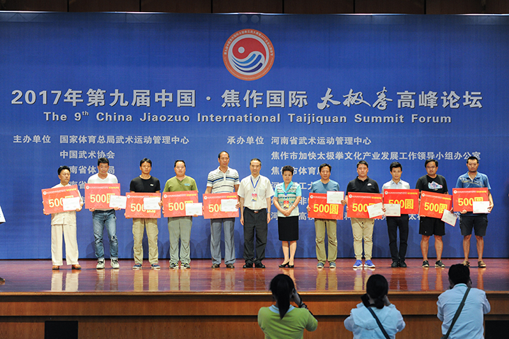 高峰论坛还进行了优秀学术论文评审表彰,组委会共收到来自全国各地高校、科研院所、太极拳协会等机构的论文83篇,参审论文69篇。论文内容涉及:太极拳发展战略、太极拳国际化与全国推广、太极拳文化产业等领域。在激昂的乐曲声中,张跃敏、卫中玲等为太极拳学术论文获奖者颁奖。鉴于我校在2017年第九届中国·焦作国际太极拳高峰论坛工作中做出的优异成绩,本届论坛授于学校“太极拳理论研究优秀组织奖”。贾书君为我校颁发了奖牌。