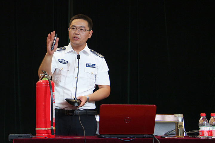 省消防协会培训中心的教官作消防知识讲座。教官结合火灾事故案例,讲解了如何预防火灾事故的发生、灭火器材的使用、火场逃生及学生公寓用火、用电安全等消防常识,警示同学们要重视消防安全,不断提高消防安全意识,掌握扑救初起火灾、逃生自救等知识。