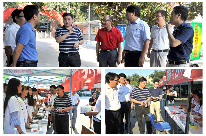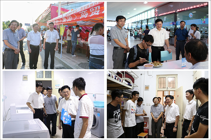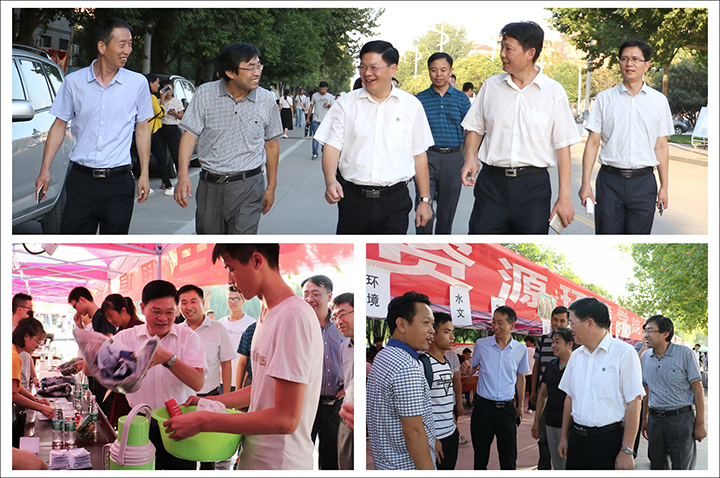9月7日,是焦作南、北校区2017级本科新生报到第一天。学校领导心系迎新工作,校党委书记邹友峰、校长杨小林、校党委副书记安士伟,校长助理孟钟剑先后来到南校区明德广场和北校区网球场的迎新工作点,在绿色通道、学院迎新处、寝具发放处、生活用品购买处等检查指导工作,详细了解迎新工作进展和新生入学报到情况,并深入学苑餐厅、学士餐厅和新生宿舍,查看新生的餐饮、住宿基本情况,看望慰问新生及家长。