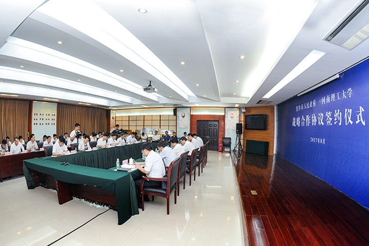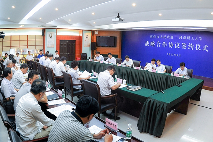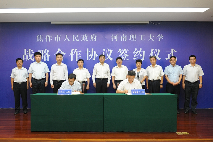 在与会领导与企业嘉宾的共同见证下,校长杨小林和焦作市副市长乔学达代表双方,共同在《焦作市人民政府、河南理工大学全面战略合作协议书》上签字。