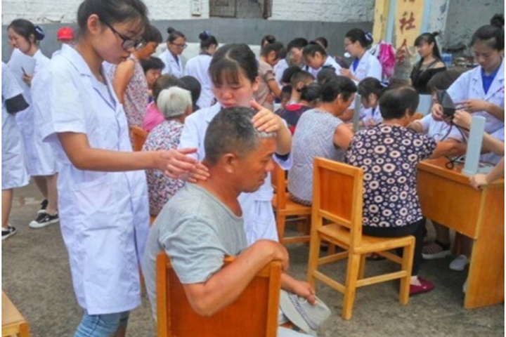 因事先通知了村民有关义诊活动的相关事宜,很多村民一大早就在广场上等待着志愿者们的到来。到达当阳峪村后,志愿者们顾不上休息便开始为村民们测量血压、血糖。检查完身体后,很多人并没有着急离开,而是向志愿者咨询了各种有关高血压和高血糖的问题。通过志愿者们的详细讲解,他们对这些疾病有了更深入的了解,从而能更好地预防和治疗高血压、高血糖等疾病。除了量血压、测血糖,“爱心医药下乡”实践服务队还带来了艾盒。将艾盒里的艾柱点着,再将艾盒固定在患处,可以起到除湿祛除的作用。志愿者们细心地给村民们带上艾盒,并为他们进行按摩。