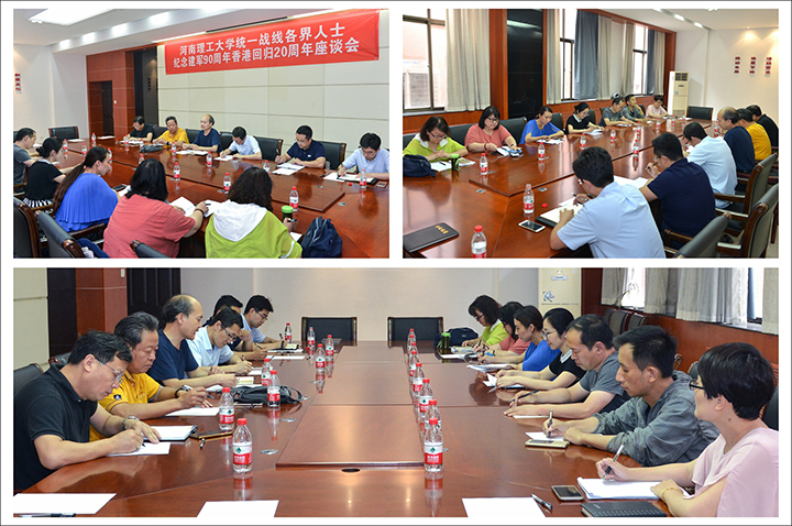 6月23日下午,学校在明德楼二楼会议室召开统一战线各界代表人士纪念建军90周年香港回归20周年座谈会。苏现波、刘宇、曾玉凤、杨磊、张小东、张盛、杨健辉、冯有利、张燚、何苗、杨波等市政协委员,民主党派基层组织负责人及代表、无党派人士代表、归国留学人员代表和少数民族代表参加会议。座谈会主题是缅怀党的丰功伟绩,激发干事创业激情。统战部部长铁占续主持座谈会。