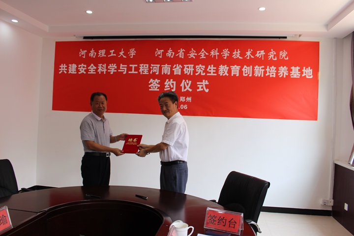 协议签署仪式前,徐照昇、周英、程金虎分别代表河南省安全生产监督管理局、河南理工大学、河南省安全科学技术研究院发表讲话。接着,周英、程金虎分别代表我校和河南省安全科学技术研究院签署了合作共建协议,双方还就联合共建基地的有关事宜做了进一步沟通和交流。该基地由我校安全学院与河南省安全科学技术研究院共建,基地以研究生创新能力培养为核心,本着“面向现场技术难题、培养创新型高层次人才,资源共享、优势互补,互惠互利、共谋发展”的原则,积极探索适合我省经济社会发展的研究生教育创新培养新路子,建立高校和科研院(所)协同育人的研究生人才培养新模式,激发研究生、指导教师和科技人员的积极性和创造性,为中原经济区建设培养更多更好的高层次、复合型、创新型人才。