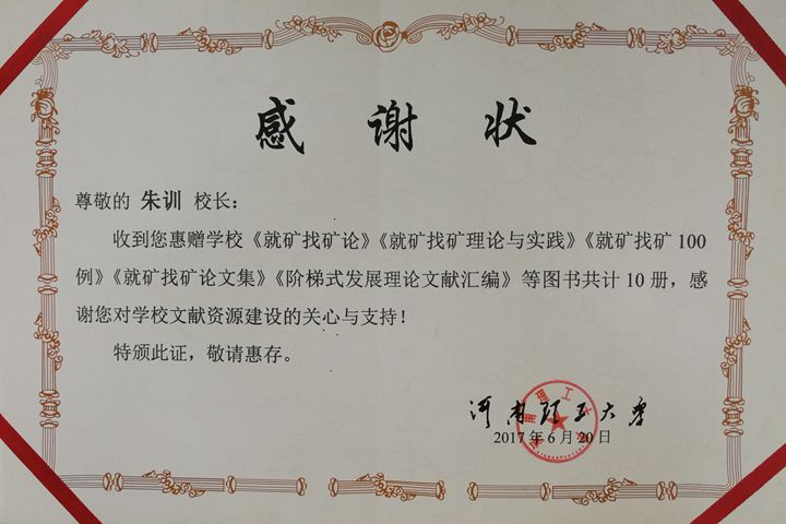 朱老此次捐赠的《就矿找矿丛书》为2016年6月首次出版。该套丛书共四本,包括《就矿找矿论》《就矿找矿的理论与实践》《就矿找矿论文集》《就矿找矿100例》。丛书凝聚了朱老找矿哲学和阶梯发展理论的思想精华,是一套完整的地质学理论体系,是对找矿哲学思维的深刻阐发,是对马克思主义哲学理论的具体运用与发展,对找矿突破战略行动具有重大的实践意义,更是一部为后人留下的博大精深的找矿经验典籍。