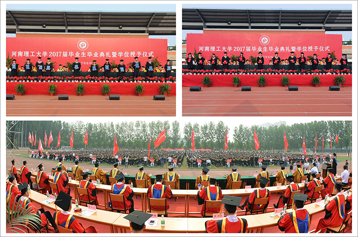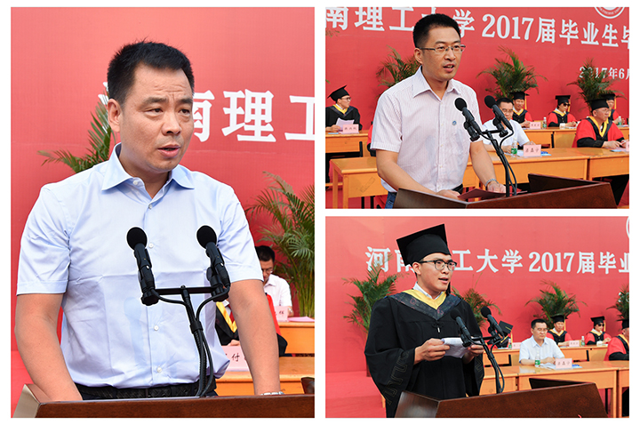校党委副书记卫中玲,副校长周英、张锟分别宣读了关于表彰优秀毕业生和颁发2017届本专科毕业生毕业证书、授予学位证书的决定。在欢快的音乐声中,校领导和校友代表分别为2017届省级、校级优秀毕业生代表颁发荣誉证书,为本专科毕业生代表颁发毕业证书、学位证书,并合影留念。教师代表、校级太行学者、电气学院教师卜旭辉在发言中,寄语同学们要“奋斗不息、永不言败”;毕业生代表、测绘学院学生韩炳权,代表全体2017届毕业生表达对母校的感恩和惜别之情;校友代表、南方中金环境股份有限公司总裁郭少山,表达对学校的深厚感情和对毕业生的美好祝愿。