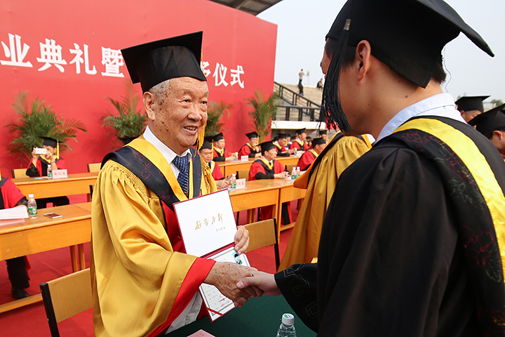 学校名誉校长朱训为毕业生拨正流苏,授予学位