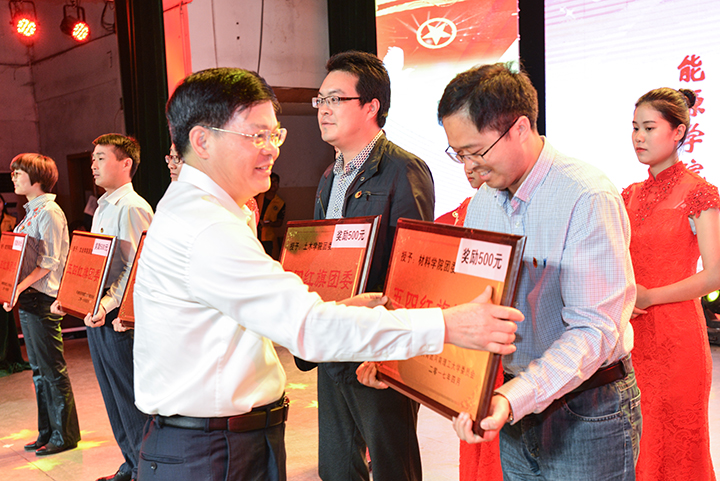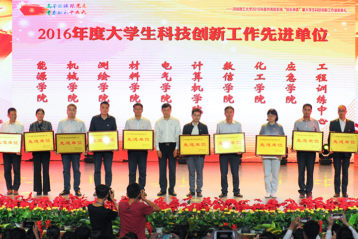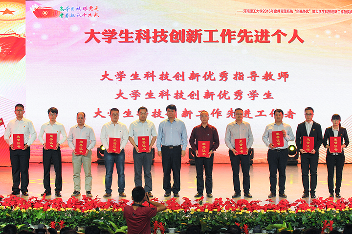 与会领导为荣获“五四红旗团委”“十佳团支部书记”“创新争优先进个人”的团体或个人颁奖,表彰他们在过去一年对团委工作和科技创新事业做出的突出贡献。安全学院安全工程2013级4班刘俭荣获“优秀团员特别奖”。刘俭是焦作市首例成功捐献造血干细胞的在校大学生,他用生命的种子诠释了奉献社会的价值,他的事迹体现了当代大学生强烈的社会责任感和敢于吃苦、勇于奉献的优秀品质。