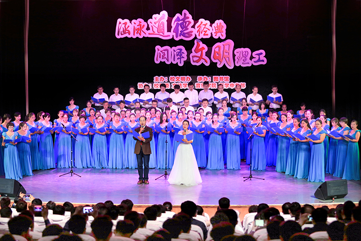 4月28日,由校文明办主办、图书馆承办,以“涵泳道德经典,润泽文明理工”为主题的“道德经典诵读”活动启动仪式暨示范诵读,在南校区小礼堂成功举行。校党委副书记安士伟出席。校文明办、党委宣传部、学生工作部(处)、校团委、图书馆等部门和各学院党委(总支)的负责同志参加。近千名师生共同欣赏了一场精彩的书香盛典。