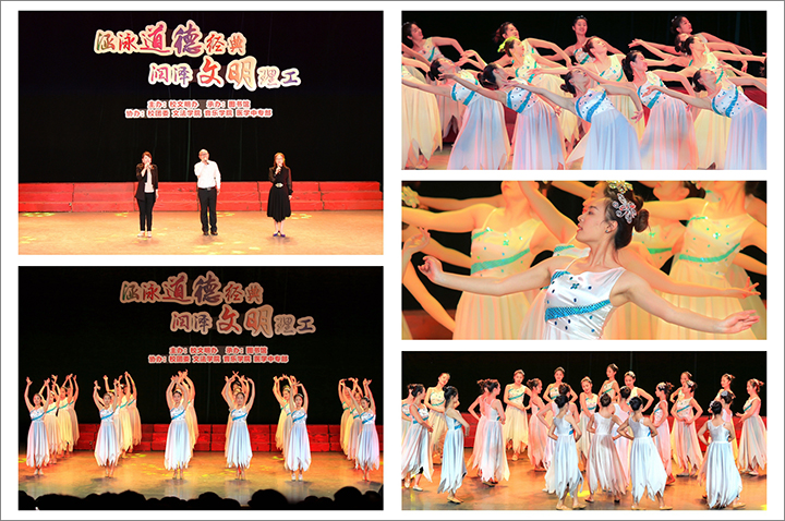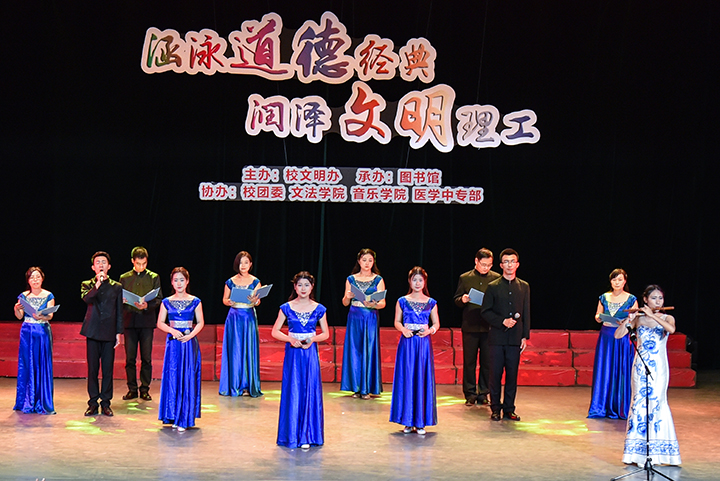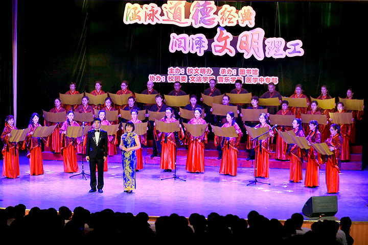 在悠扬的琴笛声中,道德经典诵读活动拉开帷幕。文法学院诵读者用一篇《寻李白》,让观众穿越历史,重回盛唐,在古长安城中,找寻“斗酒诗百篇”的酒中仙、诗中仙。盛唐虽去,李白犹在,他潜身万卷诗书中,漫步在历史长河。沿河直上,溯源追根,医学中专部的诵读者们身着汉服,手执黄卷,声声《论语》,让现场观众仿佛身临古杏坛,聆听孔夫子的谆谆教诲。音乐学院诵读者深情演绎了诗人艾青的名篇《我爱这土地》,音乐、舞蹈和诗歌的完美结合,将诗人为祖国前途、命运担忧,心力交瘁的情状表现的淋漓尽致,抒发出深沉而又真挚的爱国情感,引发全场师生的情感共鸣。最后,由全校34个党委(党总支)的教职工诵读志愿者组成的合诵团,一起诵读《大学》《孟子》《留侯论》等一篇篇脍炙人口的道德经典名篇,给观众带来深刻的人生启迪和高雅的艺术享受。
