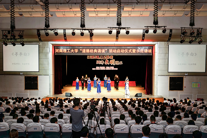 据悉,“道德经典诵读”活动启动仪式暨示范诵读,由学生工作部(处)、校团委、文法学院、音乐学院、医学中专部共同协办,是学校组织开展的“道德经典诵读”系列活动之一,也是引领广大师生讲道德、尊道德、守道德,建设书香校园,推进全国文明单位创建的重要抓手。同时,根据工作安排,图书馆作为活动的主要承办单位还组织编印了“道德经典诵读手册”,安排开展了道德经典书法比赛和展示活动、道德经典诵读交流会、“道德经典”知识竞赛等师生喜闻乐见的系列活动,旨在以传承和弘扬中华优秀文化为核心,以诵读道德经典为主要内容,引导广大师生汲取道德精髓,提升道德素质,深化道德实践,进一步提升校园文明程度,为实现我校创建全国文明单位和焦作市创建全国文明城市提名城市的宏伟目标提供丰润的道德滋养。